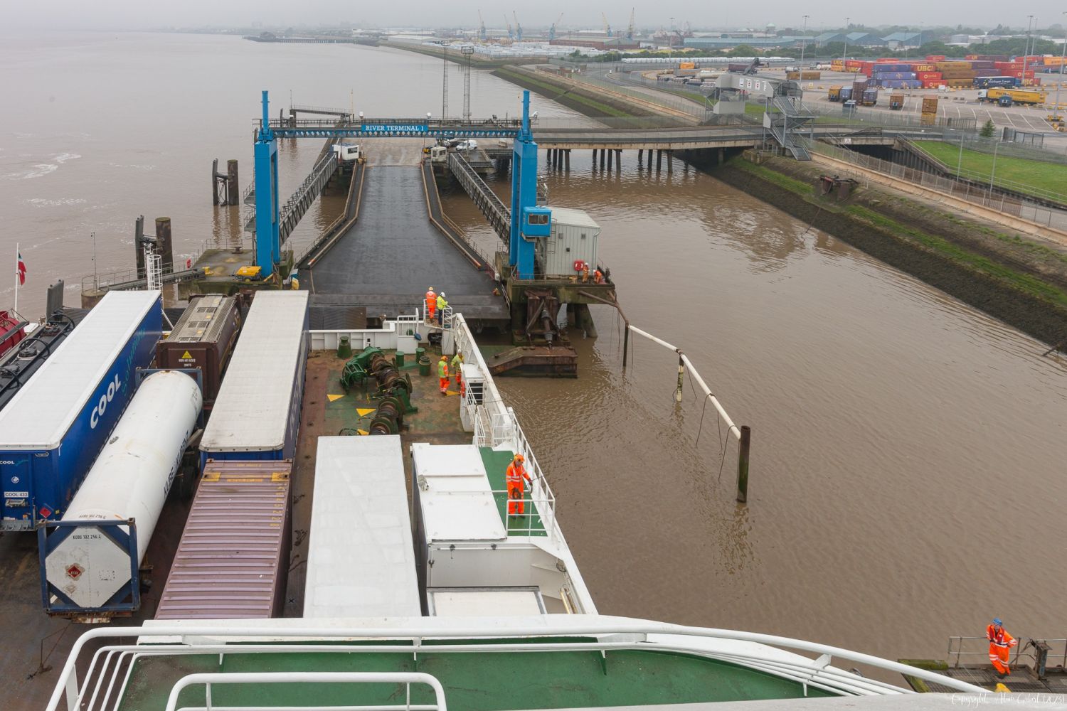 Déchargement du ferry sur le Port de Hull au petit matin.