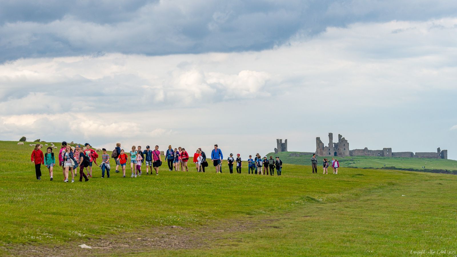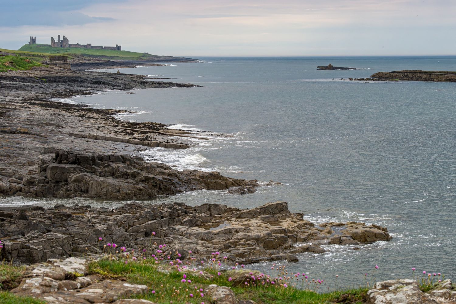 Depuis la plage nous apercevons le squelette des ruines du château de Dunstanburgh qui s'avance vers le ciel et la mer.