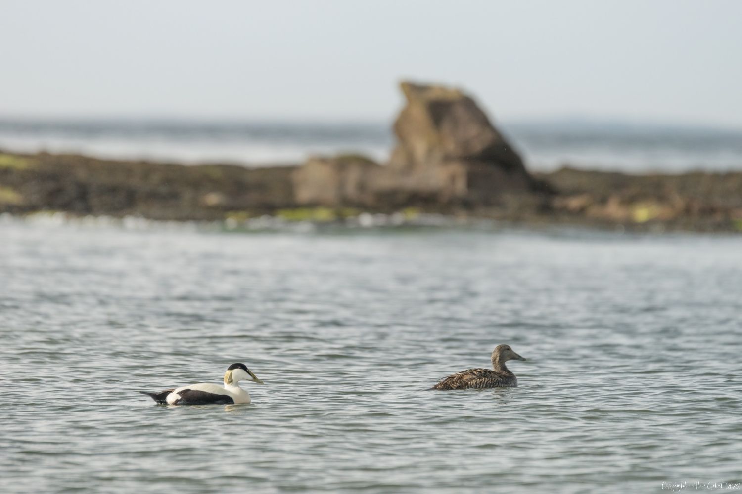 Le temps est malheureusement morose. Il pleut et un voile nuageux ne permet pas de voir à plus d'une vingtaine de mètres les eiders qui nous accueillent dans le port. Nos boitiers et nos objectifs photos sont protégés par un imperméable ne facilitant pas la manipulation. Nous essuyons les bancs du bateau en nous asseyant avant de partir pour une visite qui durera six heures.