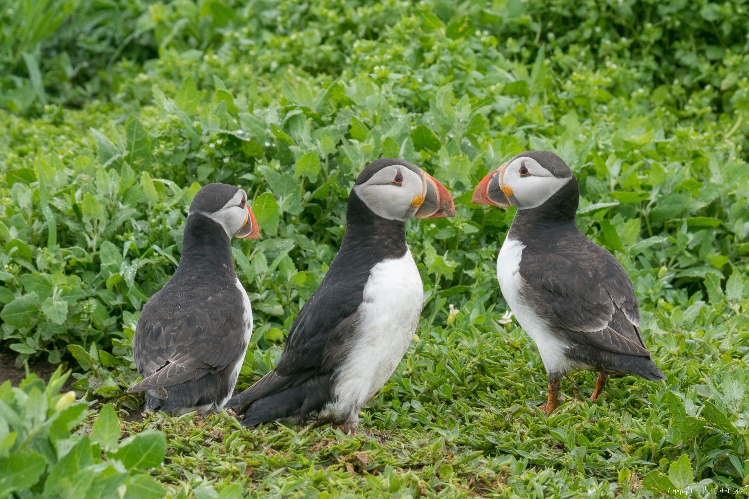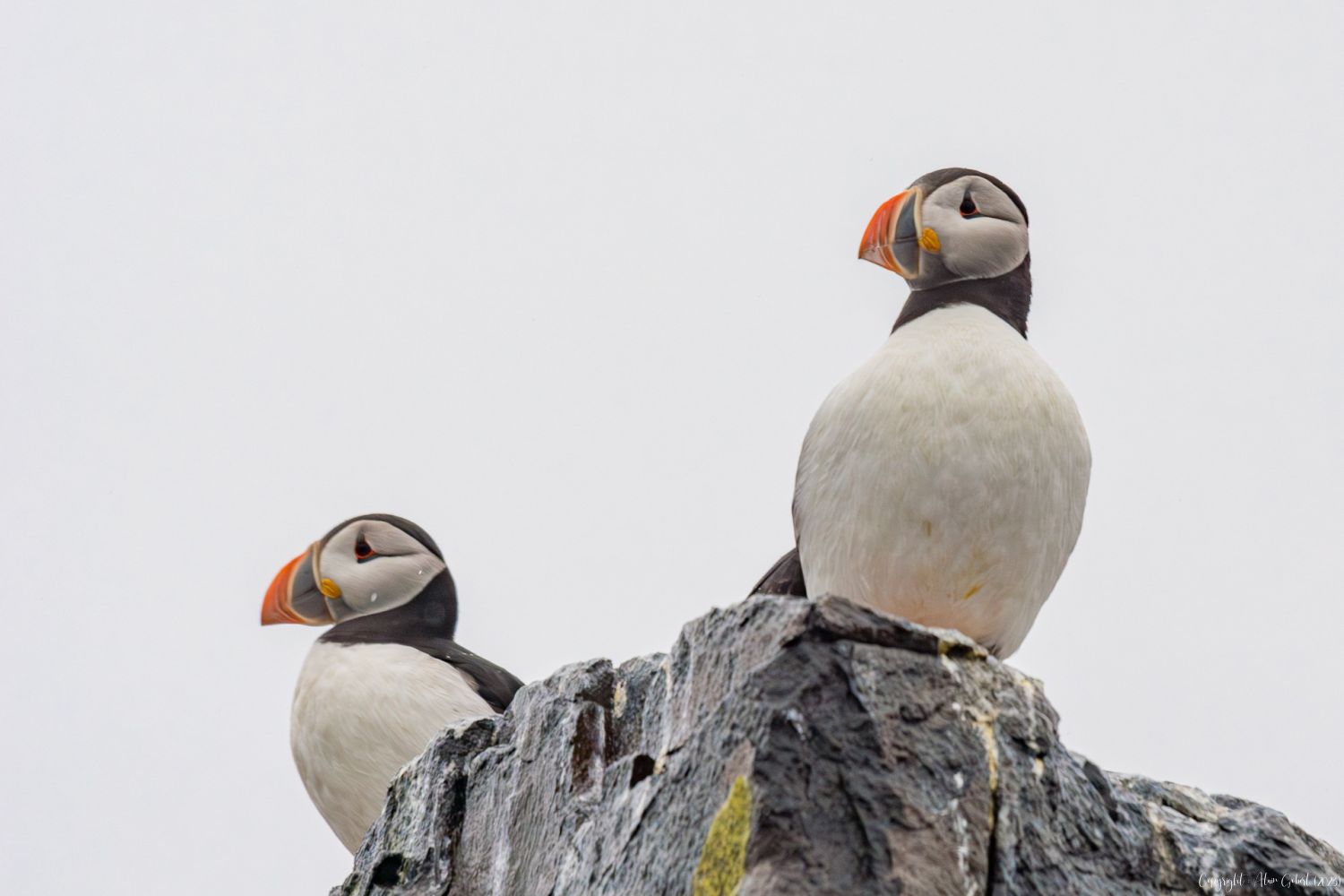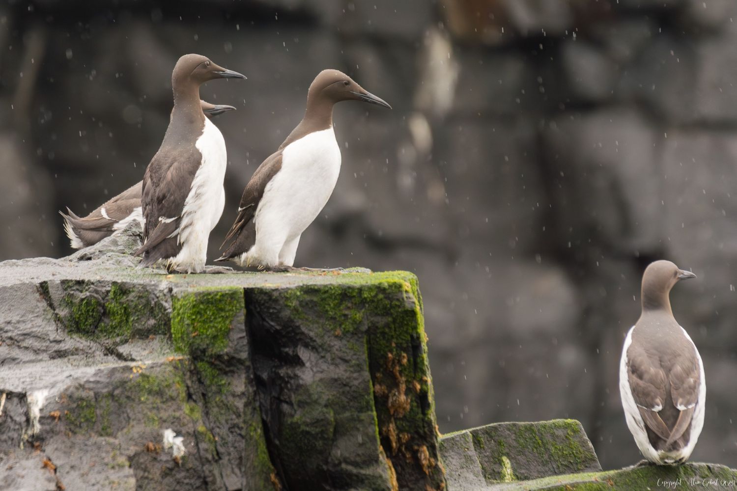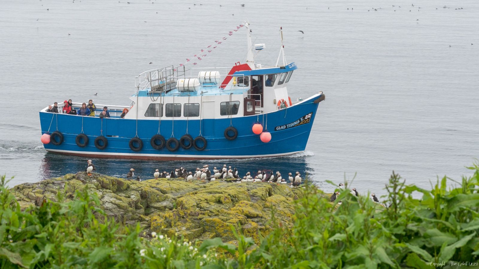 Malgré la vision voilée, ce sera vite l'émerveillement. Tout d'abord la présence de quelques guillemots s'enfuyant à l'approche du bateau puis des troupes plus nombreuses incluant des pingouins torda et, enfin, quelques macareux.