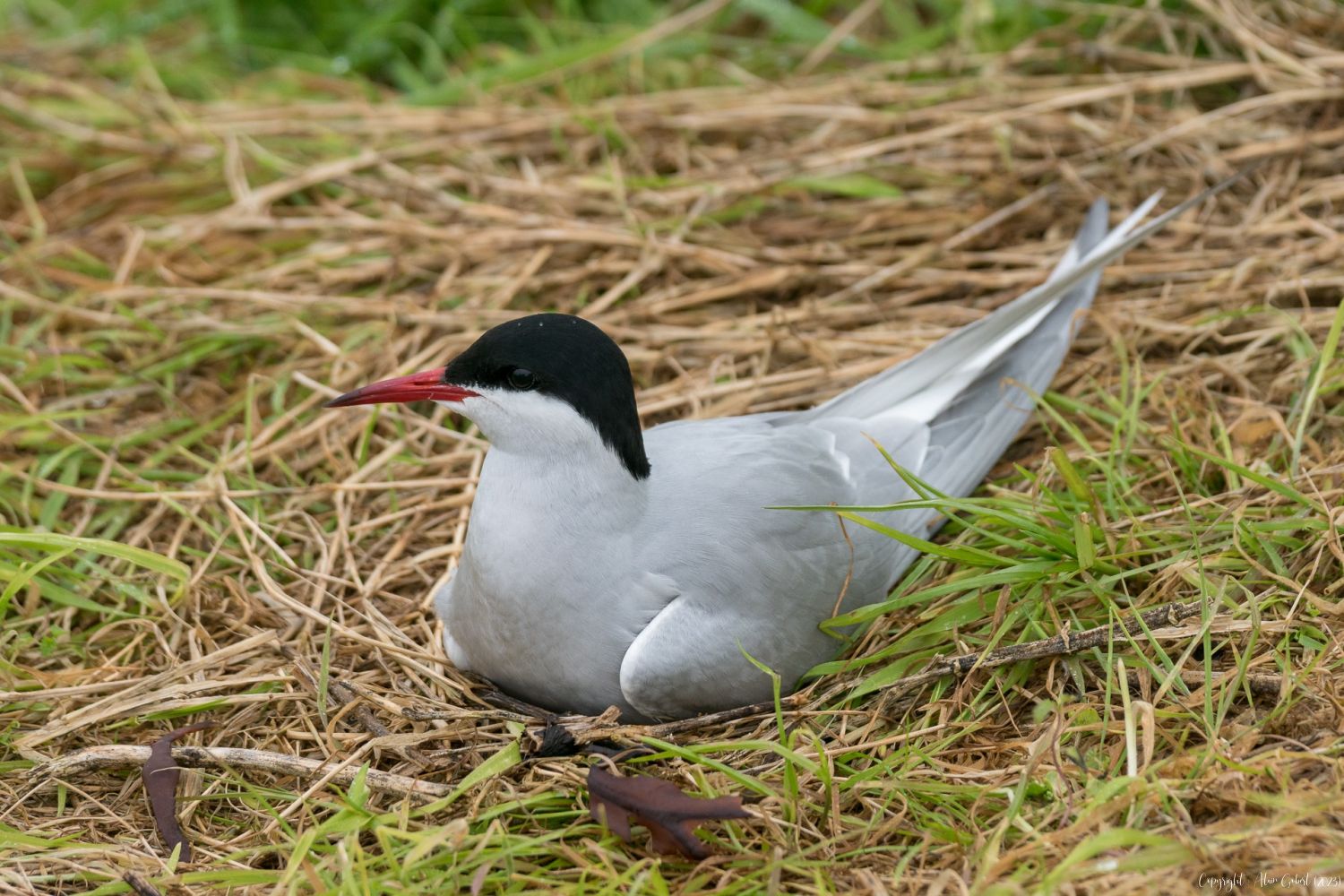Dès que nous passons la plage et posons le pied sur la terre ferme nous repérons des sternes qui nichent dans l'herbe en bordure du chemin. Dès notre passage elles s'envolent en poussant des "kri-err", des "kikikikik" et des "kiri kiri", montent de quelques mètres et se laissent tomber, le bec en avant sur la tête des malheureux passants. Notre venue ne leur fait visiblement pas plaisir et certaines nous laissent même quelques fientes bien placées en guise de bienvenue. Vite, nous évitons les prises de bec en plaçant un objet en hauteur et en nous éloignant de quelques mètres.