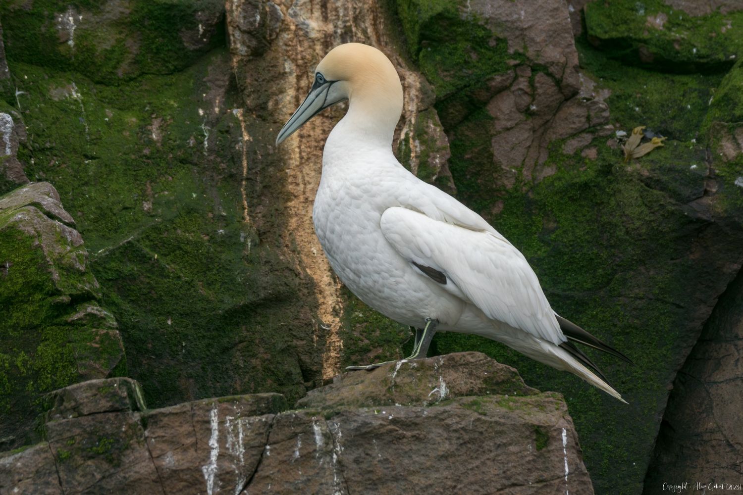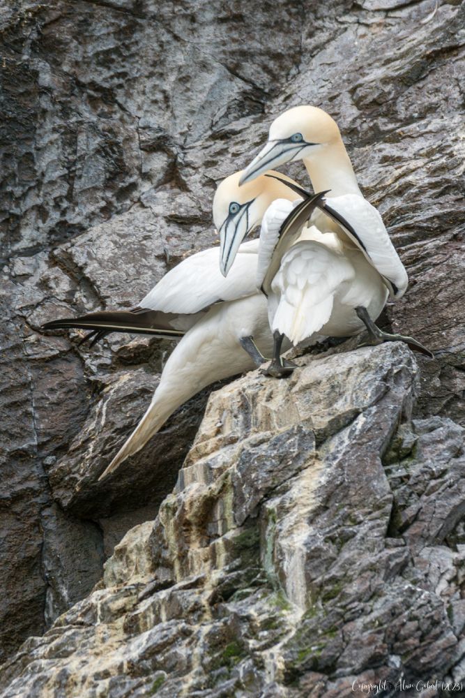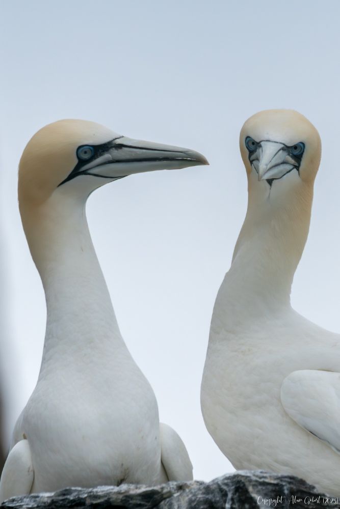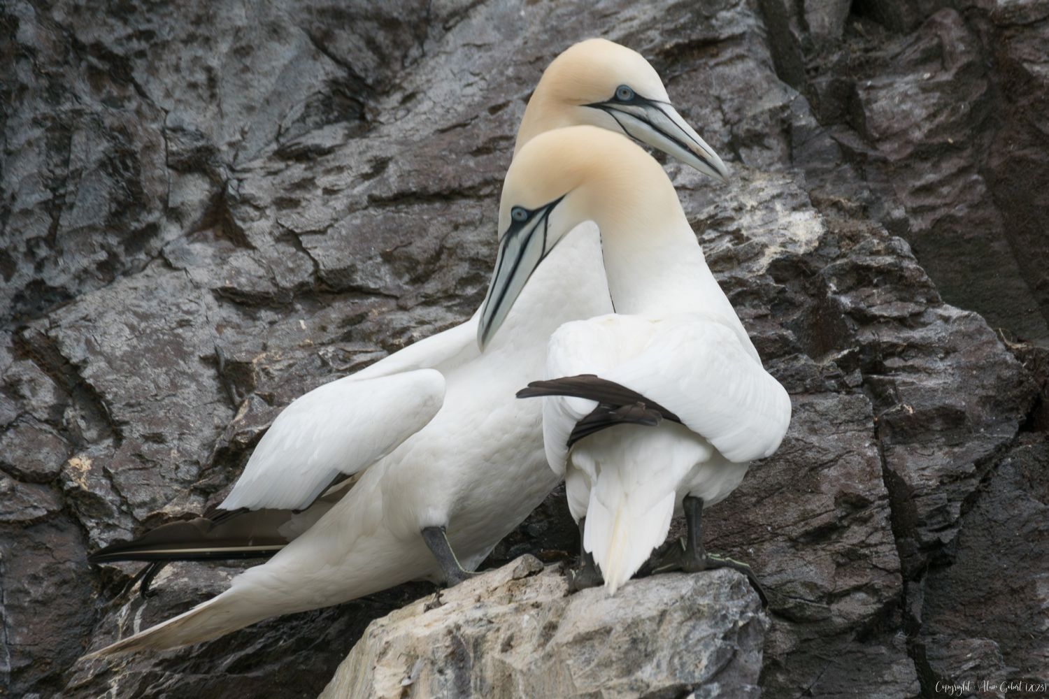 Le bateau est maintenant plus proche. Nous sommes à quelques mètres des oiseaux. Nous pouvons les observer le temps, trop court, d'une pause agitée par les vagues. Les fous de Bassan forment un couple pour la vie.