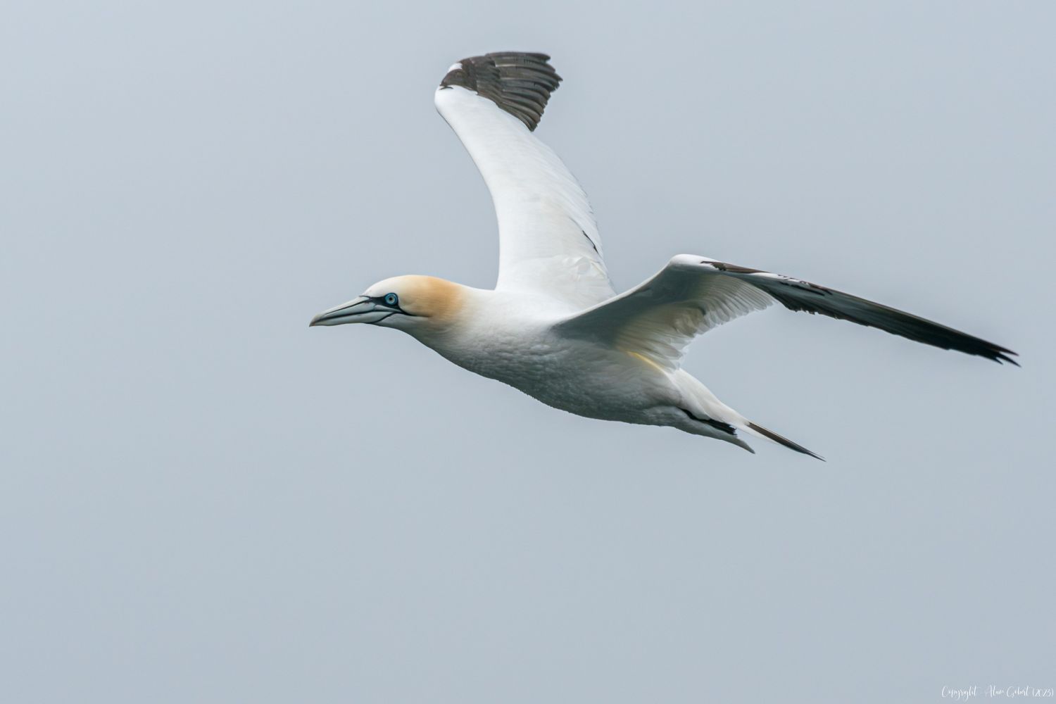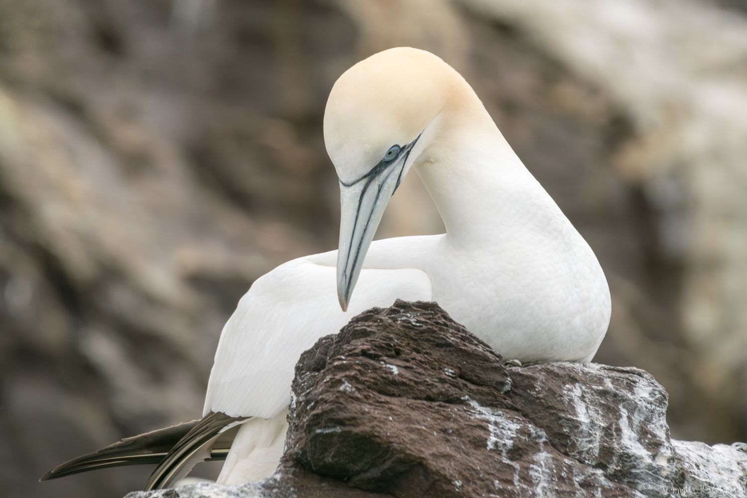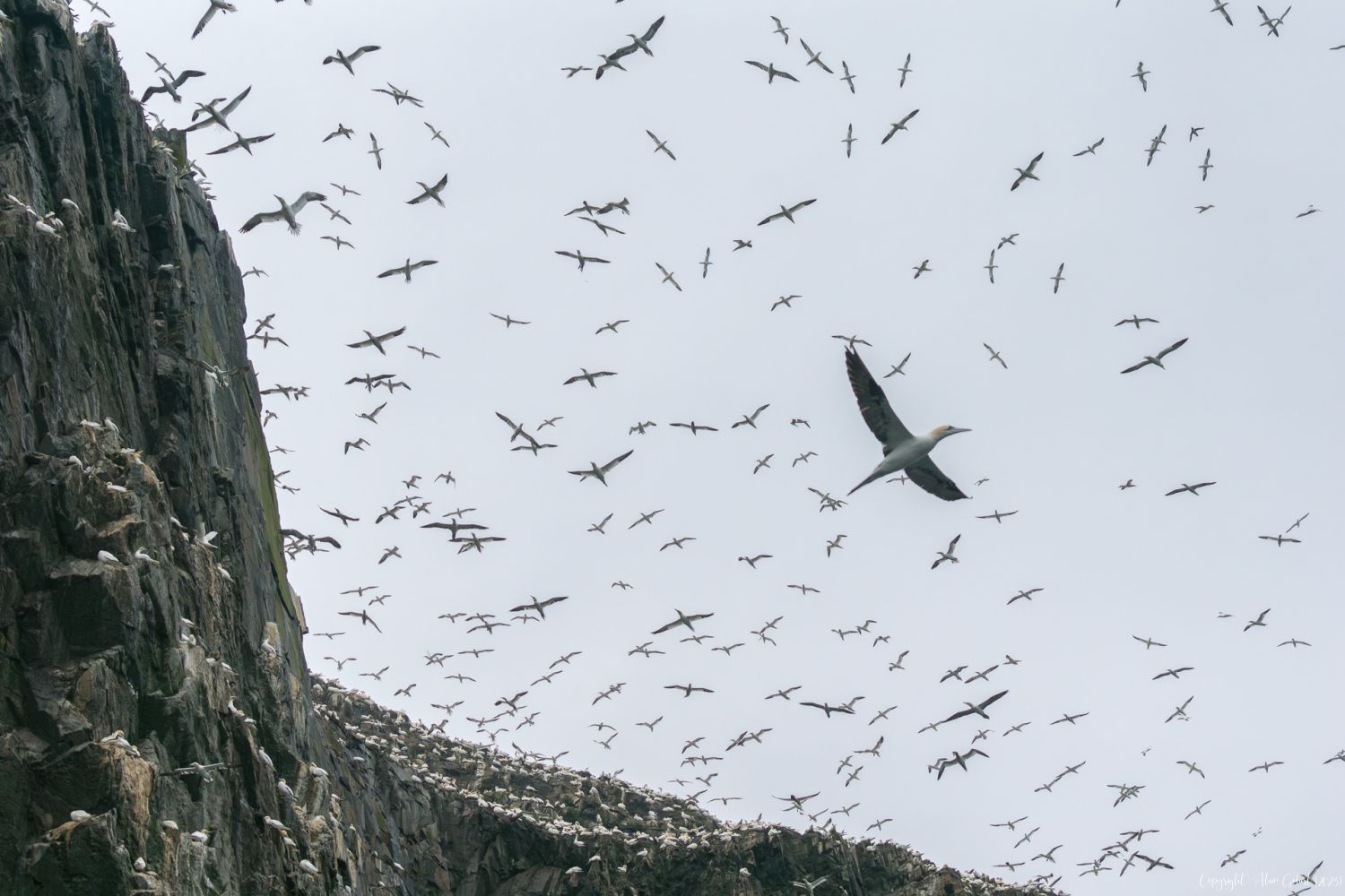 Ce qui impressionne le plus en arrivant près du rocher c'est le nombre d'oiseau en vol. Ils me font penser aux moucherons que l'on observe dans les rayons de lumière des sous bois. Seulement ces moucherons font tout juste un peu moins de 1m 80 d'envergure. Quel est donc le contrôleur aérien de génie qui veille aux trajet de ces planeurs au corps blanc et au bout d'aile noir ?