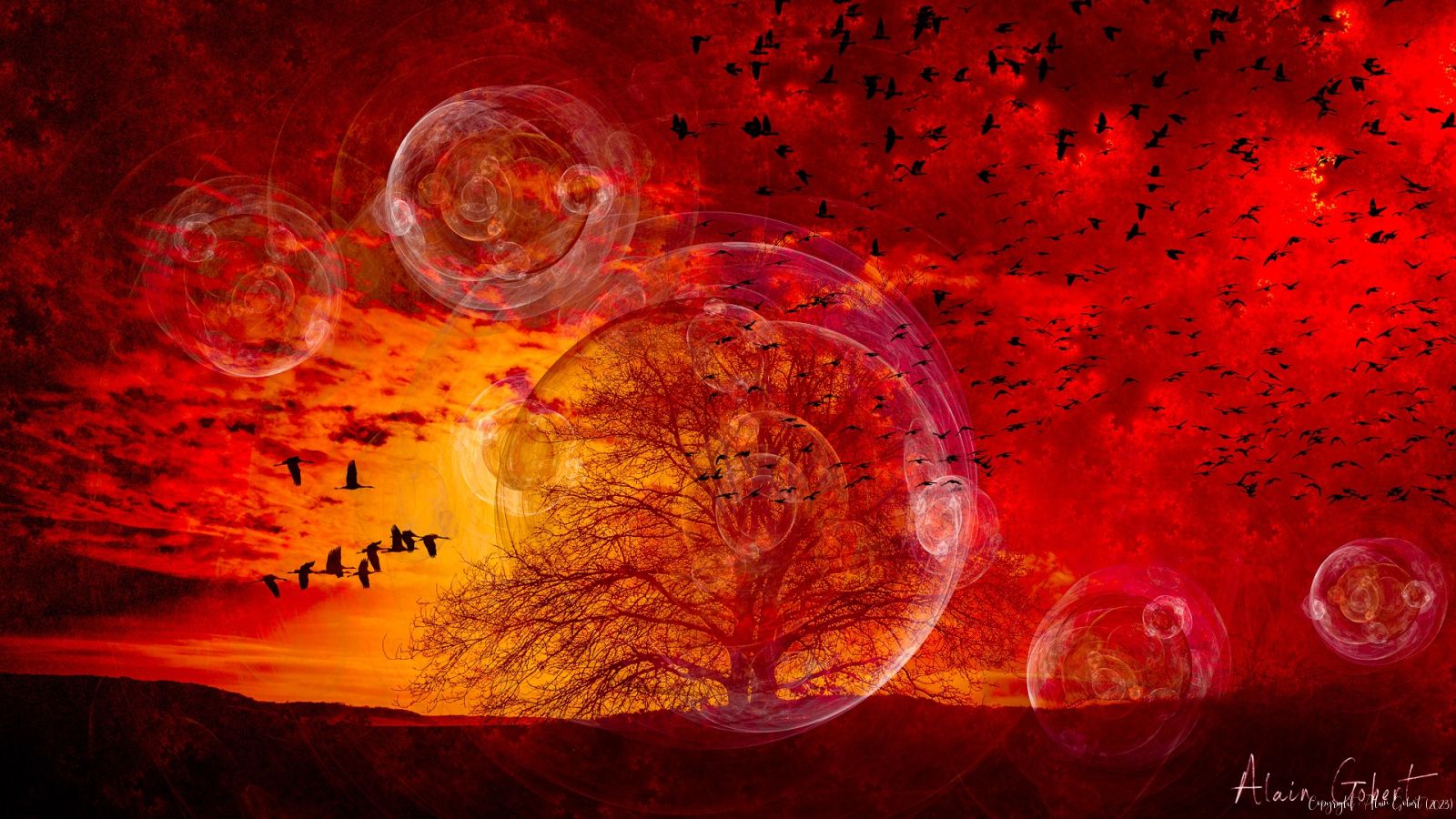 La sphère était devenue immense, Elle emplissait maintenant tout l'espace. Il y avait, dedans, une nuit éclairée par des milliers d'étoiles, des racines semblant aspirer le ciel et, au milieu de cette forêt sombre, une clairière flamboyante.