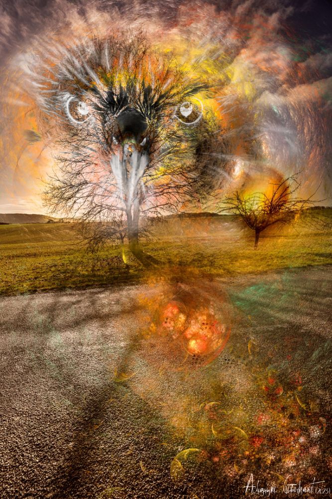 Quelques arbres, plus jeunes, étaient agenouillés au pied du vieux chêne terrassé par l'âge. Regardent ils le champignon, fossoyeur du bois mort avec mélancolie, ou bien prient ils pour indiquer au chêne une voie plus rapide vers le paradis des êtres de la forêt ?