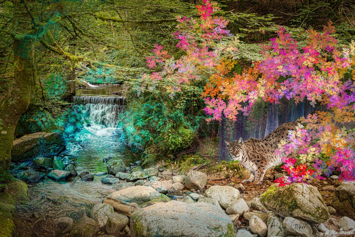 Deux grands yeux de lynx me regardent puis observent les fillettes. Le grand chat sauvage se tient là, au pied de plantes exotiques. C'est un animal fantôme, une créature qu'elles n'avaient jamais eu la chance de croiser en pleine liberté. Pourtant, dans ce livre féérique, il est là, présent à proximité d'un ruisseau enchanteur. Le lynx vient s'y désaltérer régulièrement. Il sait que les menthes poivrées y trempent souvent leurs feuillages en y déposant une empreinte rafraîchissante.