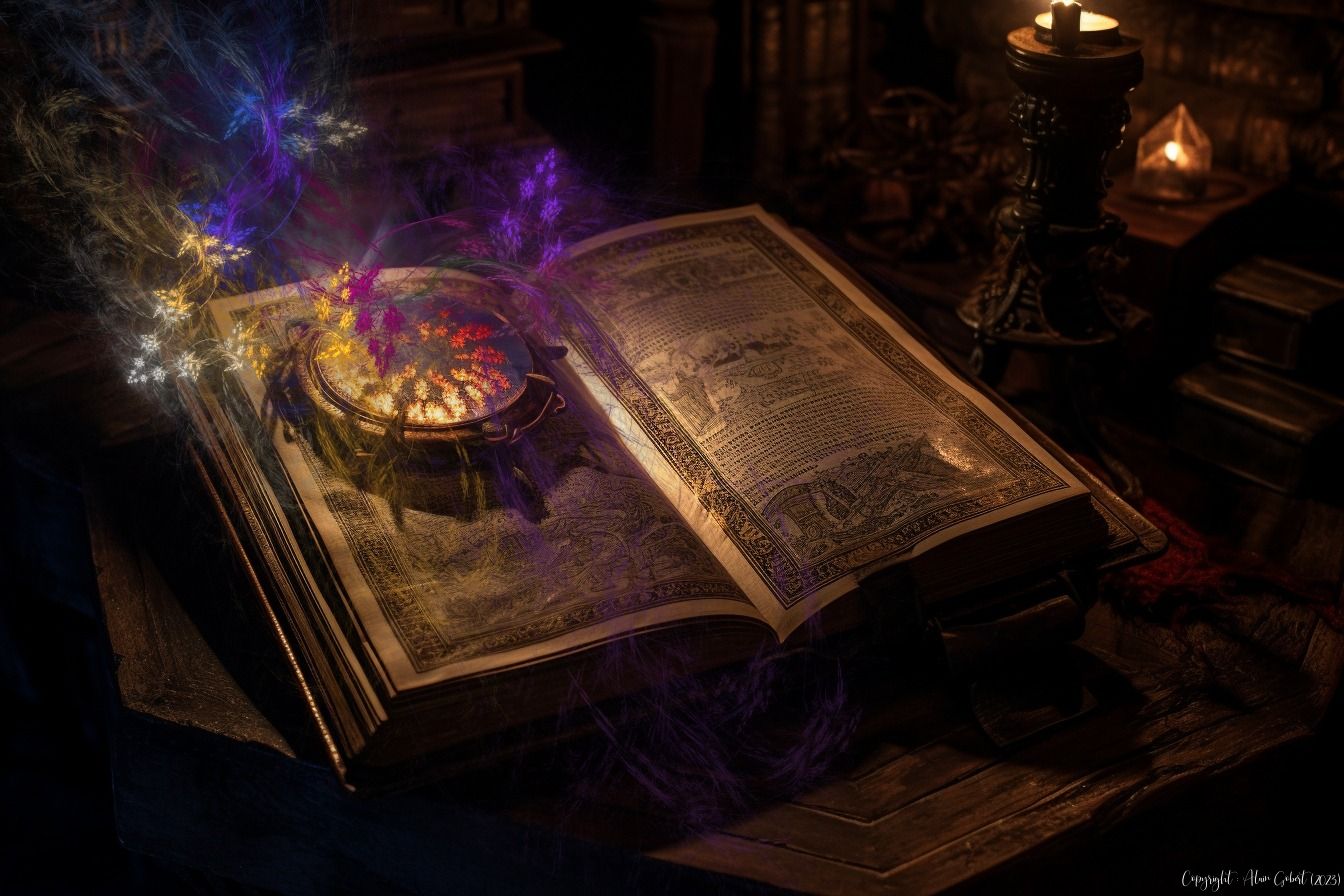 L'enluminure des pages semblaient, elles, dessinées par un tatoueur médiéval. Elles étaient faites en plein et en délié avec pour thèmes les fleurs ou les serpents, les nuages et les éclairs, les arbres ou encore les ruisseaux. Il en sortait de temps à autre de jolis petits flash de lumière bleus.