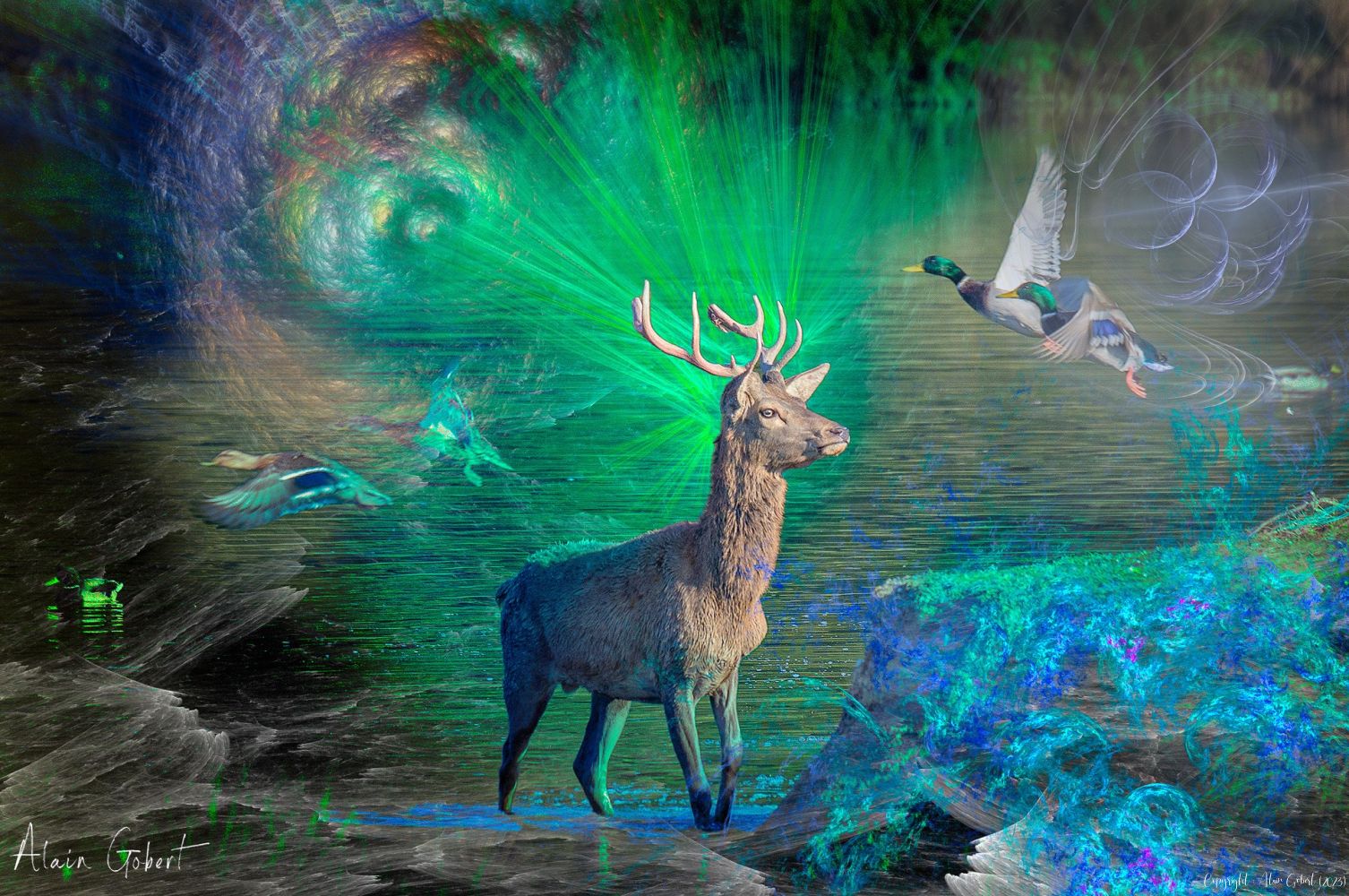 Arrivé à quelques mètres, tous les colverts s'élevèrent en un mouvement coordonné, battant leurs ailes à l'unisson. Le vent, pris au dépourvu, lutta pour reprendre son souffle, tentant désespérément de s'accrocher aux bois du cerf. Cependant, l'effet de masse des colverts en plein vol était puissant. Leurs ailes agissant comme un contrevent, le vent fut repoussé, incapable de résister à la force conjuguée de leurs mouvements.